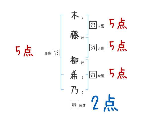 天運![]() | 木藤都希乃さんの天運は23画の5つ星!想像力に優れ活力がある。一代で成功し名誉を手に入れる。 家系が持つ宿命的な運勢を表します。祖先から受け継いだ苗字ですので自分の力が及びません。家柄を象徴します。 |