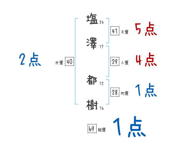 天運![]() | 塩澤都樹さんの天運は41画の5つ星!大志を抱き、目標に向かって実力を発揮し達成する。温和な性格。 家系が持つ宿命的な運勢を表します。祖先から受け継いだ苗字ですので自分の力が及びません。家柄を象徴します。 |