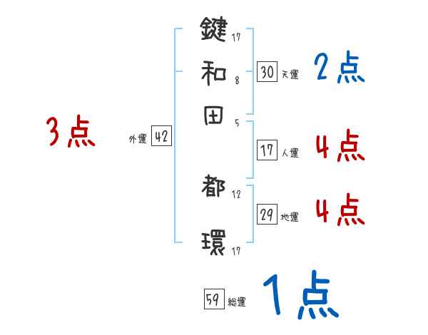 天運![]() | 鍵和田都環さんの天運は30画の2つ星!浮き沈みの激しさに注意しましょう。 家系が持つ宿命的な運勢を表します。祖先から受け継いだ苗字ですので自分の力が及びません。家柄を象徴します。 |