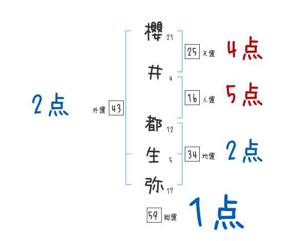人運![]() | 櫻井都生弥さんの人運は16画の5つ星!人望が厚く大きく発展する。逆転成功が見える。 性格や才能などを表す2番目に重要な運勢です。人間関係や協調性、社会的な成功に影響します。主に20歳から50歳ぐらいまでの中年期の運勢を表します。 |