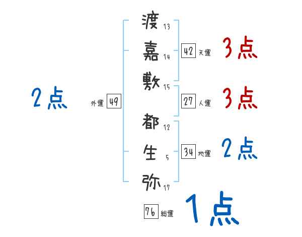 人運![]() | 渡嘉敷都生弥さんの人運は27画の3つ星!頭脳明晰だが強情で摩擦が多い傾向。孤立に注意。 性格や才能などを表す2番目に重要な運勢です。人間関係や協調性、社会的な成功に影響します。主に20歳から50歳ぐらいまでの中年期の運勢を表します。 |