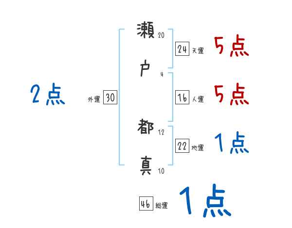 天運![]() | 瀬戸都真さんの天運は24画の5つ星!家庭運が良く順調な人生。金運にも恵まれる。 家系が持つ宿命的な運勢を表します。祖先から受け継いだ苗字ですので自分の力が及びません。家柄を象徴します。 |
