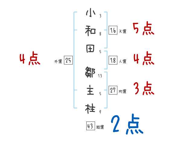 天運![]() | 小和田鄒主柱さんの天運は16画の5つ星!人望が厚く大きく発展する。逆転成功が見える。 家系が持つ宿命的な運勢を表します。祖先から受け継いだ苗字ですので自分の力が及びません。家柄を象徴します。 |