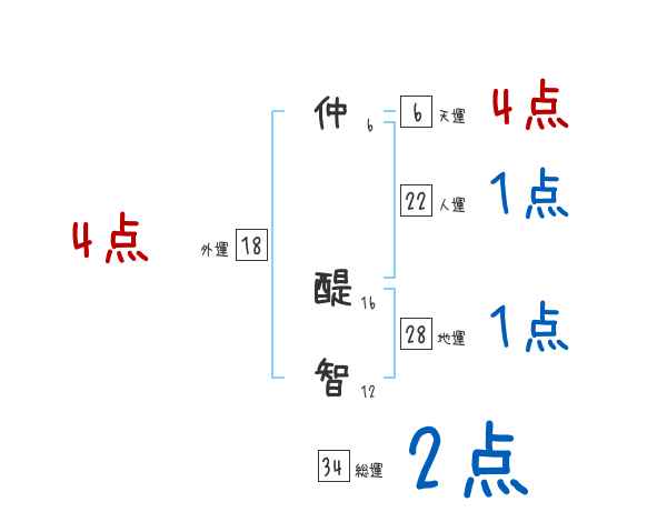 天運![]() | 仲醍智さんの天運は6画の4つ星!慎重な努力家で信頼を得る。誠実な精神で向上心に優れる。 家系が持つ宿命的な運勢を表します。祖先から受け継いだ苗字ですので自分の力が及びません。家柄を象徴します。 |