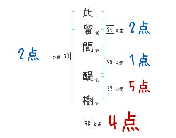 天運![]() | 比留間醍樹さんの天運は26画の2つ星!波瀾万丈かも。信頼できる人を大事にしましょう。 家系が持つ宿命的な運勢を表します。祖先から受け継いだ苗字ですので自分の力が及びません。家柄を象徴します。 |