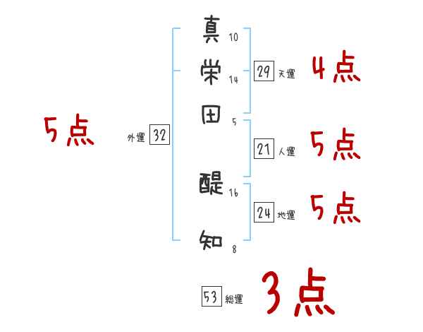 外運![]() | 真栄田醍知さんの外運は32画の5つ星!柔軟性があり成功する。チャンスが多く金運が良い。 生活面を象徴する運勢です。外部から受ける影響力を表し、結婚運、家庭運や職場、環境への順応性を表します。 |