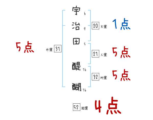 地運![]() | 宇治田醍醐さんの地運は32画の5つ星!柔軟性があり成功する。チャンスが多く金運が良い。 個性を表す基礎的な運勢です。性格形成や対人関係、行動力など家庭環境に影響されます。主に誕生してから20歳くらいまでの若年期の運勢を表します。 |