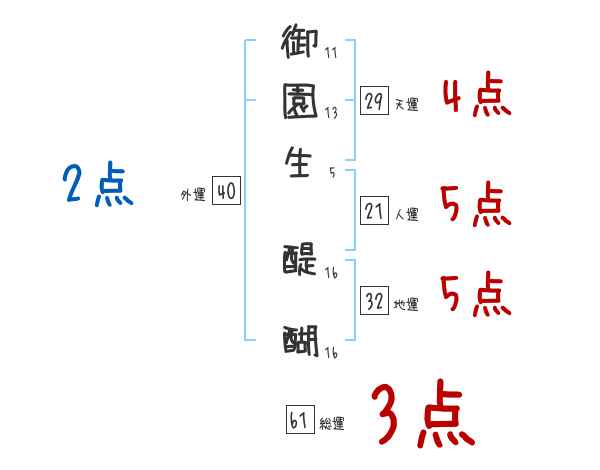 人運![]() | 御園生醍醐さんの人運は21画の5つ星!統率力がある。独立し成功する。名誉を手に入れる。 性格や才能などを表す2番目に重要な運勢です。人間関係や協調性、社会的な成功に影響します。主に20歳から50歳ぐらいまでの中年期の運勢を表します。 |