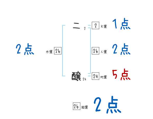 外運![]() | 二醸さんの外運は26画の2つ星!波瀾万丈かも。信頼できる人を大事にしましょう。 生活面を象徴する運勢です。外部から受ける影響力を表し、結婚運、家庭運や職場、環境への順応性を表します。 |