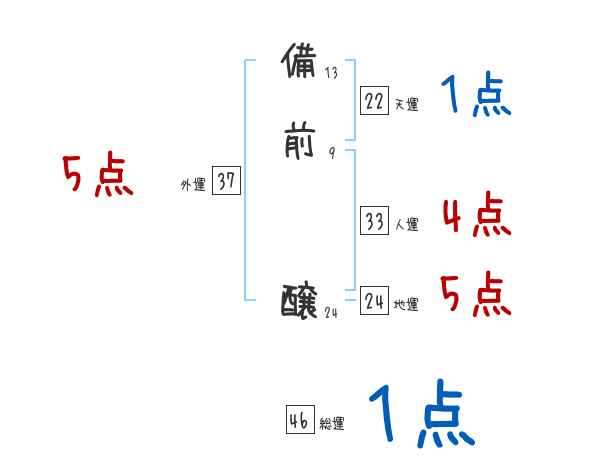 外運![]() | 備前醸さんの外運は37画の5つ星!努力家で順応性に優れる。現実的な考え方ができ忠実に物事をこなす。 生活面を象徴する運勢です。外部から受ける影響力を表し、結婚運、家庭運や職場、環境への順応性を表します。 |