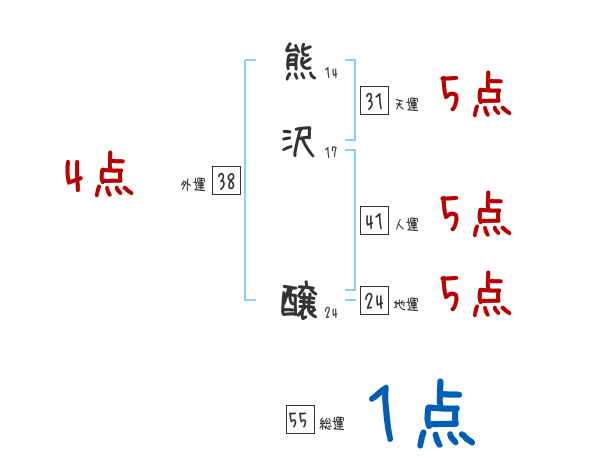 天運![]() | 熊沢醸さんの天運は31画の5つ星!社交性があり判断力に優れる。順風満帆な人生で円満な生活。 家系が持つ宿命的な運勢を表します。祖先から受け継いだ苗字ですので自分の力が及びません。家柄を象徴します。 |