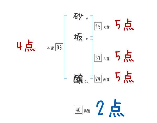 外運![]() | 砂坂醸さんの外運は33画の4つ星!権力志向でプライドが高い。勇気があり運を切り開き成功する。 生活面を象徴する運勢です。外部から受ける影響力を表し、結婚運、家庭運や職場、環境への順応性を表します。 |