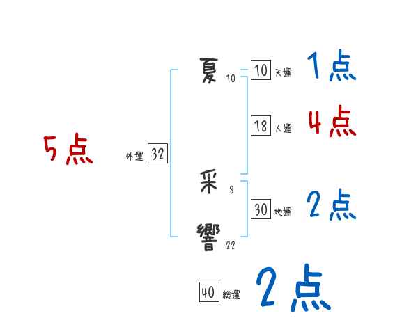 外運![]() | 夏采響さんの外運は32画の5つ星!柔軟性があり成功する。チャンスが多く金運が良い。 生活面を象徴する運勢です。外部から受ける影響力を表し、結婚運、家庭運や職場、環境への順応性を表します。 |