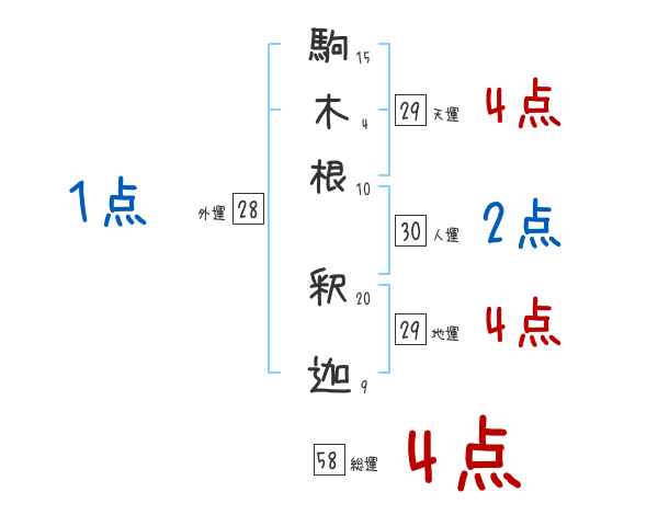 総運![]() | 駒木根釈迦さんの総運は58画の4つ星!安定した生活。大器晩成タイプ。 あなたの人生を表す1番重要な運勢です。生涯を通じて影響する総合運となり、主に50歳以降の晩年期に影響を及ぼします。 |