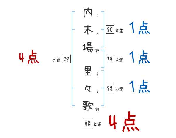 外運![]() | 内木場里々歌さんの外運は29画の4つ星!完全主義で才能がある。厳格な心の持ち主。 生活面を象徴する運勢です。外部から受ける影響力を表し、結婚運、家庭運や職場、環境への順応性を表します。 |
