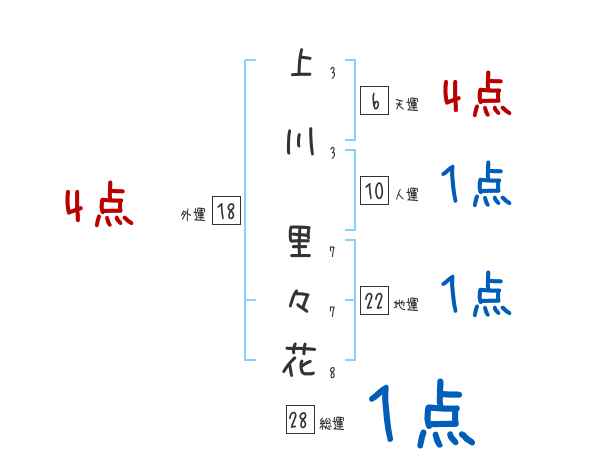 総運![]() | 上川里々花さんの総運は28画の1つ星!家庭環境に注意。スポーツで活躍できる能力があるかも。 あなたの人生を表す1番重要な運勢です。生涯を通じて影響する総合運となり、主に50歳以降の晩年期に影響を及ぼします。 |