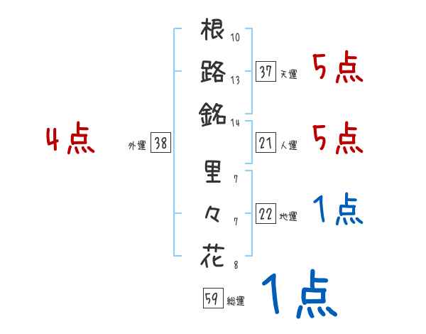 総運![]() | 根路銘里々花さんの総運は59画の1つ星!意志の弱さであきらめることが多いかも。粘り強さが必要。 あなたの人生を表す1番重要な運勢です。生涯を通じて影響する総合運となり、主に50歳以降の晩年期に影響を及ぼします。 |
