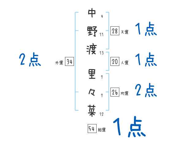 天運![]() | 中野渡里々菜さんの天運は28画の1つ星!家庭環境に注意。スポーツで活躍できる能力があるかも。 家系が持つ宿命的な運勢を表します。祖先から受け継いだ苗字ですので自分の力が及びません。家柄を象徴します。 |