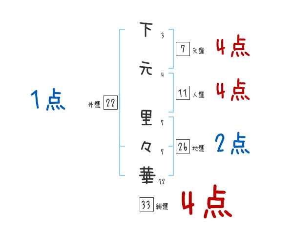 天運![]() | 下元里々華さんの天運は7画の4つ星!強い意志や信念を持ち独立心が強い。自立する。 家系が持つ宿命的な運勢を表します。祖先から受け継いだ苗字ですので自分の力が及びません。家柄を象徴します。 |
