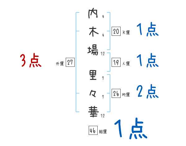 外運![]() | 内木場里々華さんの外運は27画の3つ星!頭脳明晰だが強情で摩擦が多い傾向。孤立に注意。 生活面を象徴する運勢です。外部から受ける影響力を表し、結婚運、家庭運や職場、環境への順応性を表します。 |
