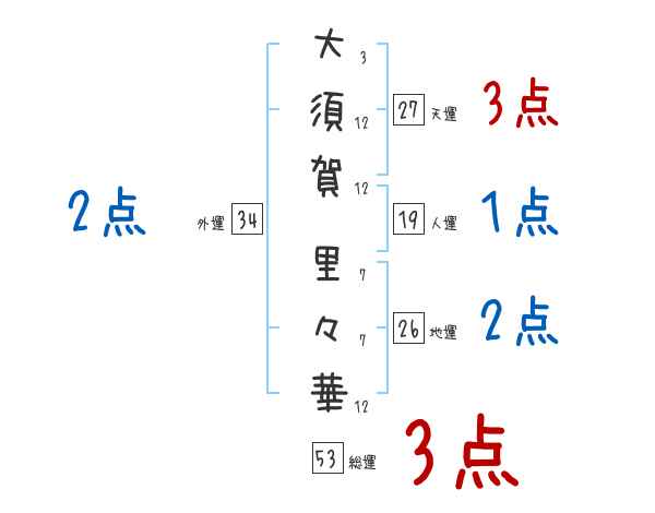 | 総運  | 大須賀里々華さんの総運は53画の3つ星!やや見栄っ張りで虚栄心がある。散財に注意。あなたの人生を表す1番重要な運勢です。生涯を通じて影響する総合運となり、主に50歳以降の晩年期に影響を及ぼします。 |