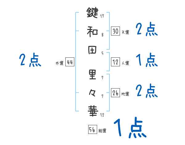 天運![]() | 鍵和田里々華さんの天運は30画の2つ星!浮き沈みの激しさに注意しましょう。 家系が持つ宿命的な運勢を表します。祖先から受け継いだ苗字ですので自分の力が及びません。家柄を象徴します。 |