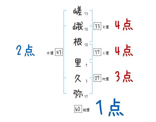 総運![]() | 嵯峨根里久弥さんの総運は60画の1つ星!悲観的で迷いやすい。波乱が多く損をしないように。 あなたの人生を表す1番重要な運勢です。生涯を通じて影響する総合運となり、主に50歳以降の晩年期に影響を及ぼします。 |