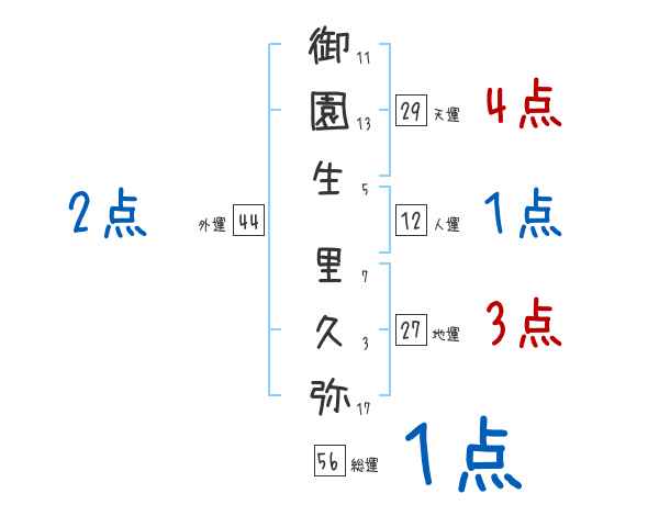総運![]() | 御園生里久弥さんの総運は56画の1つ星!消極的で無気力になりがち。誠実な気持ちが必要でしょう。 あなたの人生を表す1番重要な運勢です。生涯を通じて影響する総合運となり、主に50歳以降の晩年期に影響を及ぼします。 |