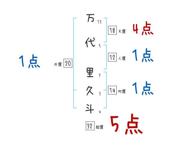 総運![]() | 万代里久斗さんの総運は32画の5つ星!柔軟性があり成功する。チャンスが多く金運が良い。 あなたの人生を表す1番重要な運勢です。生涯を通じて影響する総合運となり、主に50歳以降の晩年期に影響を及ぼします。 |