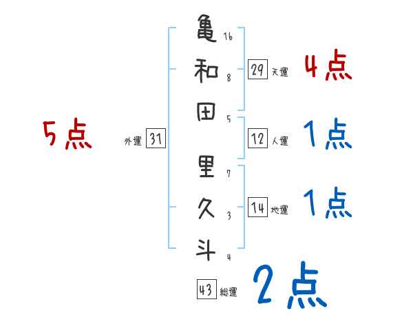 総運![]() | 亀和田里久斗さんの総運は43画の2つ星!頑固な性格で独立心が強いかも。やや非現実的で浪費に注意しましょう。 あなたの人生を表す1番重要な運勢です。生涯を通じて影響する総合運となり、主に50歳以降の晩年期に影響を及ぼします。 |