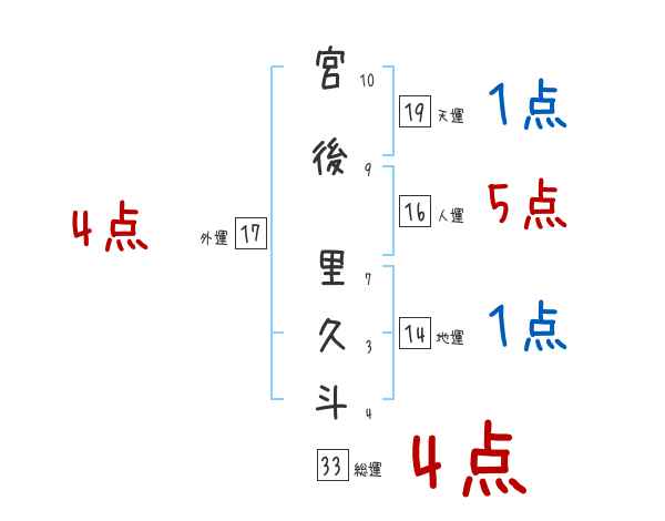 外運![]() | 宮後里久斗さんの外運は17画の4つ星!積極的な行動力。地位を気づき財産を手に入れる。純粋な心と直感力。 生活面を象徴する運勢です。外部から受ける影響力を表し、結婚運、家庭運や職場、環境への順応性を表します。 |