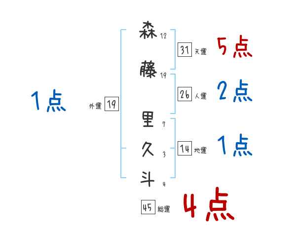 総運![]() | 森藤里久斗さんの総運は45画の4つ星!もくもくと物事を進め達成する。地味な努力家。 あなたの人生を表す1番重要な運勢です。生涯を通じて影響する総合運となり、主に50歳以降の晩年期に影響を及ぼします。 |