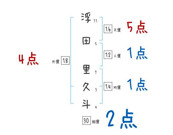 総運![]() | 浮田里久斗さんの総運は30画の2つ星!浮き沈みの激しさに注意しましょう。 あなたの人生を表す1番重要な運勢です。生涯を通じて影響する総合運となり、主に50歳以降の晩年期に影響を及ぼします。 |