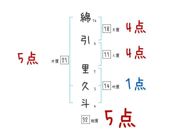外運![]() | 綿引里久斗さんの外運は21画の5つ星!統率力がある。独立し成功する。名誉を手に入れる。 生活面を象徴する運勢です。外部から受ける影響力を表し、結婚運、家庭運や職場、環境への順応性を表します。 |