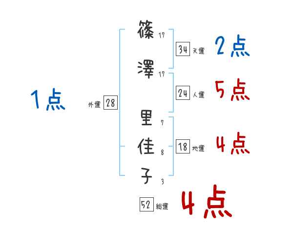 外運![]() | 篠澤里佳子さんの外運は28画の1つ星!家庭環境に注意。スポーツで活躍できる能力があるかも。 生活面を象徴する運勢です。外部から受ける影響力を表し、結婚運、家庭運や職場、環境への順応性を表します。 |