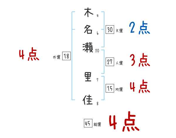 天運![]() | 木名瀬里佳さんの天運は30画の2つ星!浮き沈みの激しさに注意しましょう。 家系が持つ宿命的な運勢を表します。祖先から受け継いだ苗字ですので自分の力が及びません。家柄を象徴します。 |
