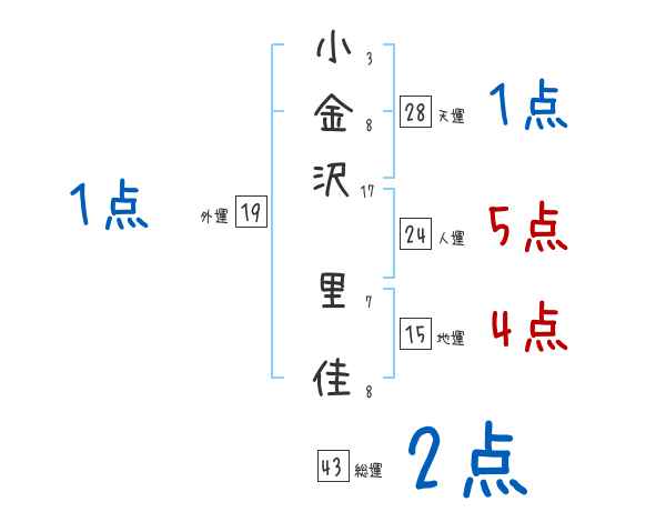 天運![]() | 小金沢里佳さんの天運は28画の1つ星!家庭環境に注意。スポーツで活躍できる能力があるかも。 家系が持つ宿命的な運勢を表します。祖先から受け継いだ苗字ですので自分の力が及びません。家柄を象徴します。 |