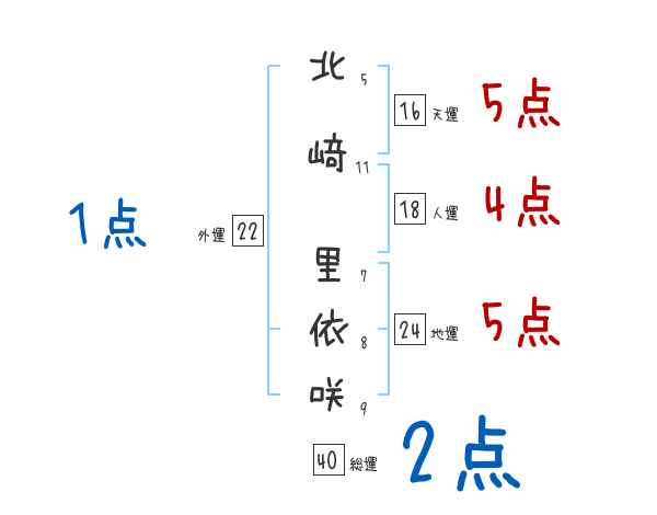 天運![]() | 北﨑里依咲さんの天運は16画の5つ星!人望が厚く大きく発展する。逆転成功が見える。 家系が持つ宿命的な運勢を表します。祖先から受け継いだ苗字ですので自分の力が及びません。家柄を象徴します。 |