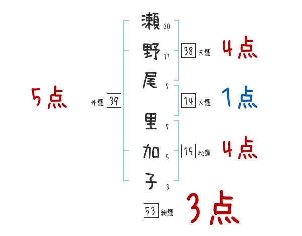 総運![]() | 瀬野尾里加子さんの総運は53画の3つ星!やや見栄っ張りで虚栄心がある。散財に注意。 あなたの人生を表す1番重要な運勢です。生涯を通じて影響する総合運となり、主に50歳以降の晩年期に影響を及ぼします。 |