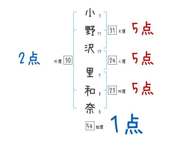 総運![]() | 小野沢里和奈さんの総運は54画の1つ星!トラブルが多いかも。周りをよく見て協調して過ごしましょう。 あなたの人生を表す1番重要な運勢です。生涯を通じて影響する総合運となり、主に50歳以降の晩年期に影響を及ぼします。 |