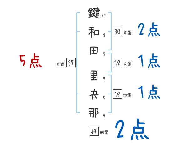 天運![]() | 鍵和田里央那さんの天運は30画の2つ星!浮き沈みの激しさに注意しましょう。 家系が持つ宿命的な運勢を表します。祖先から受け継いだ苗字ですので自分の力が及びません。家柄を象徴します。 |