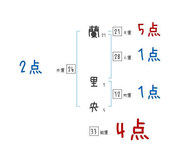 天運![]() | 蘭里央さんの天運は21画の5つ星!統率力がある。独立し成功する。名誉を手に入れる。 家系が持つ宿命的な運勢を表します。祖先から受け継いだ苗字ですので自分の力が及びません。家柄を象徴します。 |