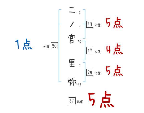 天運![]() | 二ノ宮里弥さんの天運は13画の5つ星!才能に恵まれ人気がある。名声を手に入れる。円満な人生。 家系が持つ宿命的な運勢を表します。祖先から受け継いだ苗字ですので自分の力が及びません。家柄を象徴します。 |