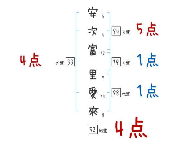 天運![]() | 安次富里愛來さんの天運は24画の5つ星!家庭運が良く順調な人生。金運にも恵まれる。 家系が持つ宿命的な運勢を表します。祖先から受け継いだ苗字ですので自分の力が及びません。家柄を象徴します。 |