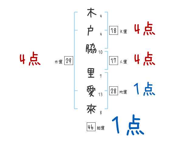天運![]() | 木戸脇里愛來さんの天運は18画の4つ星!情熱的で剛気。忍耐力があり信頼される。 家系が持つ宿命的な運勢を表します。祖先から受け継いだ苗字ですので自分の力が及びません。家柄を象徴します。 |