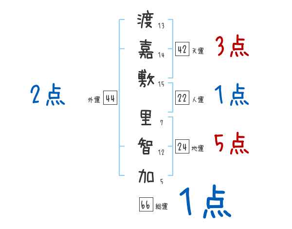 総運![]() | 渡嘉敷里智加さんの総運は66画の1つ星!迷うことが多く挫折しやすい傾向が。辛抱強く物事に取り組みましょう。 あなたの人生を表す1番重要な運勢です。生涯を通じて影響する総合運となり、主に50歳以降の晩年期に影響を及ぼします。 |