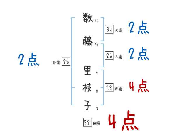外運![]() | 数藤里枝子さんの外運は26画の2つ星!波瀾万丈かも。信頼できる人を大事にしましょう。 生活面を象徴する運勢です。外部から受ける影響力を表し、結婚運、家庭運や職場、環境への順応性を表します。 |