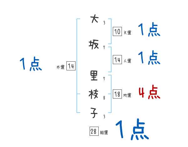 総運![]() | 大坂里枝子さんの総運は28画の1つ星!家庭環境に注意。スポーツで活躍できる能力があるかも。 あなたの人生を表す1番重要な運勢です。生涯を通じて影響する総合運となり、主に50歳以降の晩年期に影響を及ぼします。 |