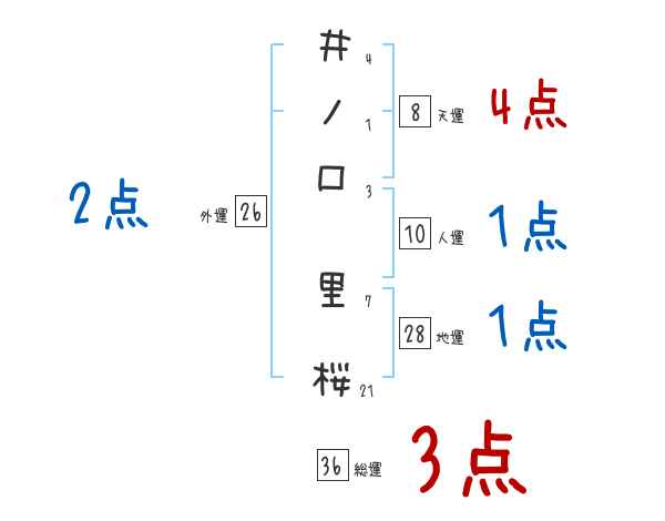 外運![]() | 井ノ口里桜さんの外運は26画の2つ星!波瀾万丈かも。信頼できる人を大事にしましょう。 生活面を象徴する運勢です。外部から受ける影響力を表し、結婚運、家庭運や職場、環境への順応性を表します。 |