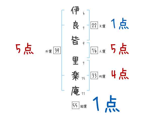 地運![]() | 伊良皆里楽庵さんの地運は33画の4つ星!権力志向でプライドが高い。勇気があり運を切り開き成功する。 個性を表す基礎的な運勢です。性格形成や対人関係、行動力など家庭環境に影響されます。主に誕生してから20歳くらいまでの若年期の運勢を表します。 |